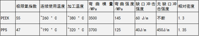 表1:PEEK和PPS基本物理和力學性能對比,測試標準ASTM