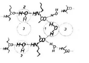 該機理認為,水分子進入尼龍6/66無定形區,優先以圖中1的形式結合(緊密結合,tightly bound),當水分子繼續增多時,出現如圖中2所示的結合形式(松散結合,loosely bound),更多的水分子將在分子間隙中通過水分子之間的氫鍵進一步堆積(clustering,如圖中3所示)。