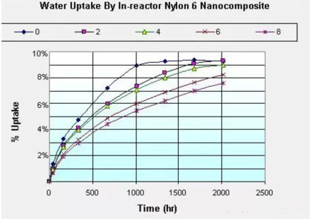 添加無機納米粒子有一定的效果。聚酰胺/層狀硅酸鹽納米復合材料能夠大幅提高力學性能、熱變形溫度、阻隔性和阻燃效果,同時添加有機蒙脫土的聚酰胺/層狀硅酸鹽納米復合料能夠降低吸水的速度。當蒙脫土的添加達到一定量時(通常大于4%),能夠降低尼龍的平衡吸水率。這是由于蒙脫土做為一種成核劑,可提高尼龍的結晶度,這樣其中的無定形區就變小,從而降低了尼龍的吸水量。
