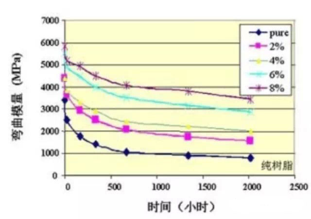 以上納米復合材料方法在減慢吸水速度、降低吸水量的同時,在很大程度上還改善了尼龍6/66因吸水帶來的不良后果。如尼龍蒙脫土納米復合材料吸水后,力學性能的下降和尺寸變化要小于純尼龍。另一方面,上文引用的這些共混和無機納米復合的報道在力學性能上均獲得改善,如Tg、模量的提高等等,就算吸水之后力學性能有所回落,回落的幅度也遠遠小于加入蒙脫土后所增加的幅度。右圖是不同含量的蒙脫土的尼龍6材料,放置一段時間后彎曲模量發生的變化,從圖中可以看出,即使是2%蒙脫土的添加量,在達到飽和吸水率后,彎曲模量也會高出純尼龍6很多。
